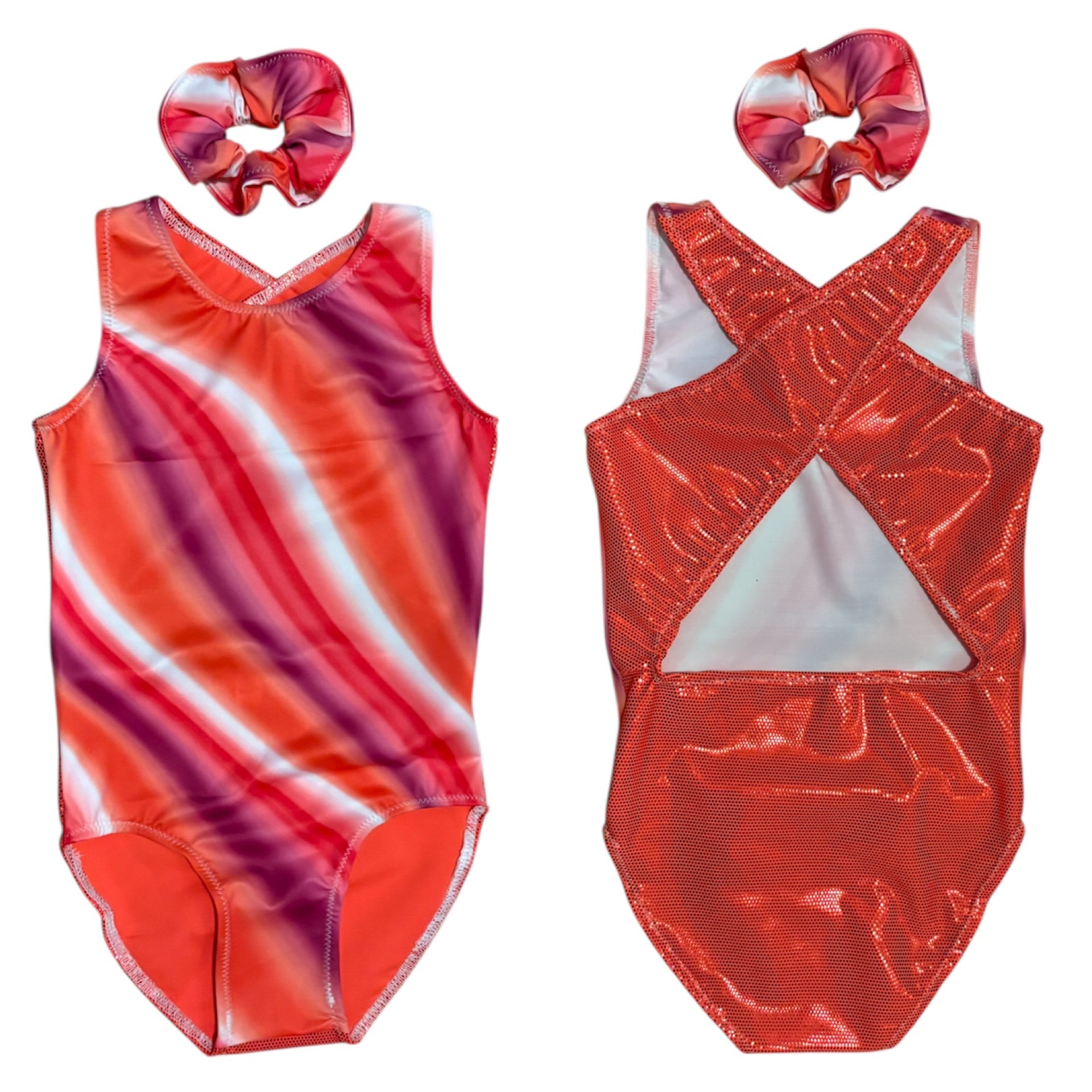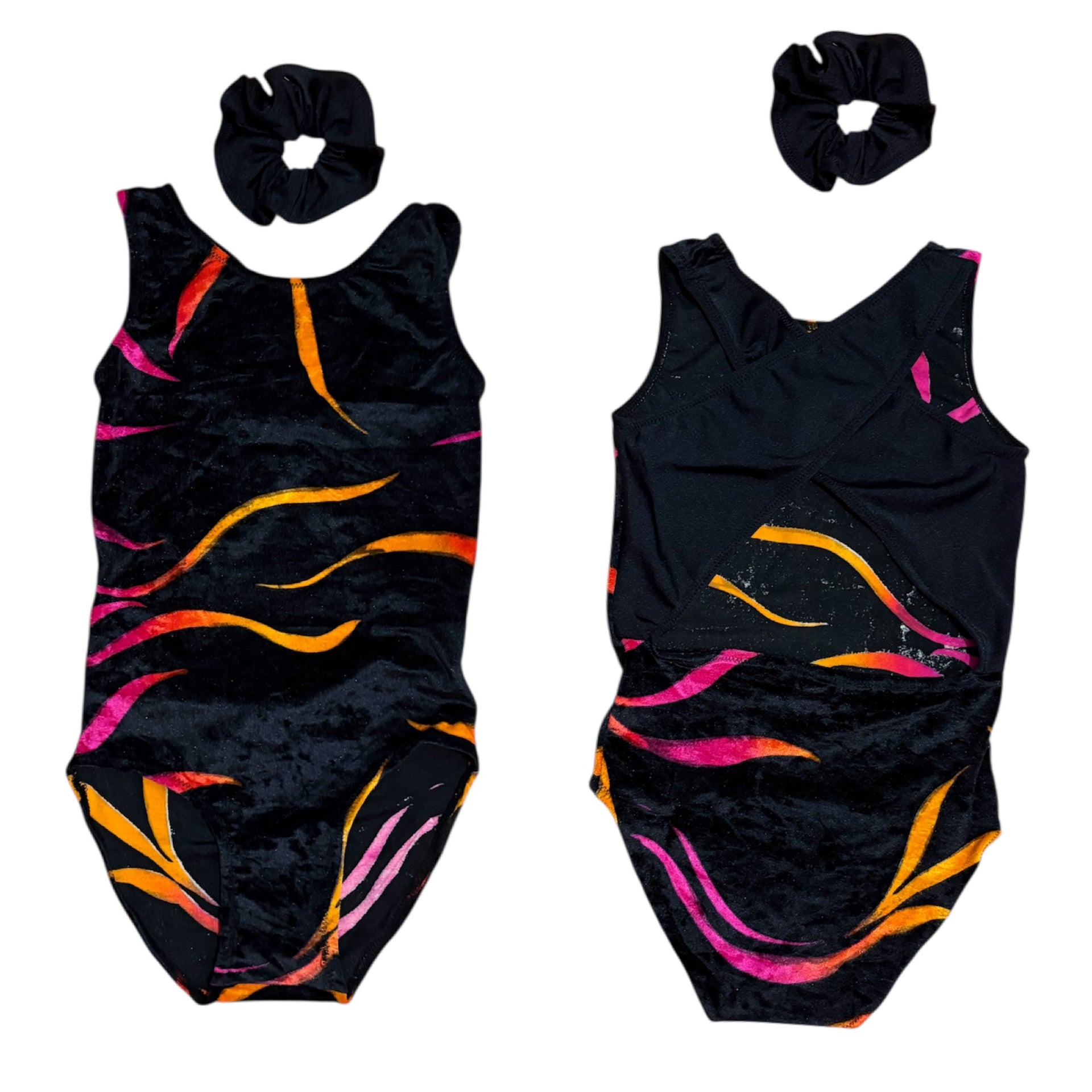 - 2x Crossback leotards with matching scrunchies. One is velour with a ribbon design and the other Lycra with a diagonal effect design matched with orange foil