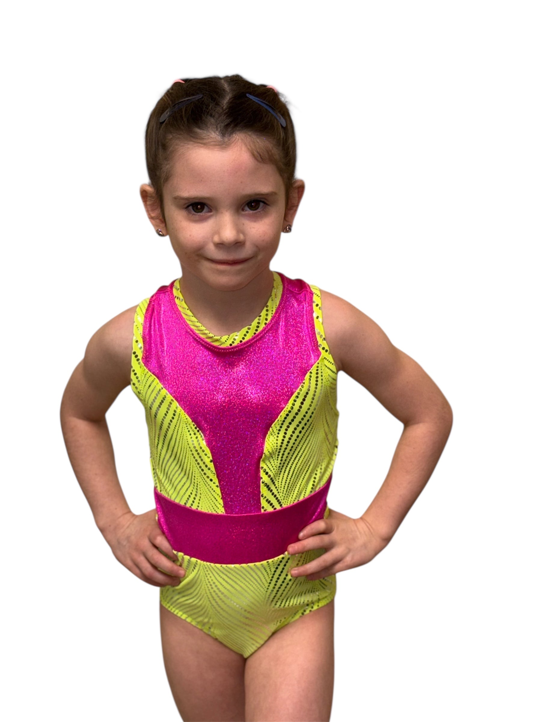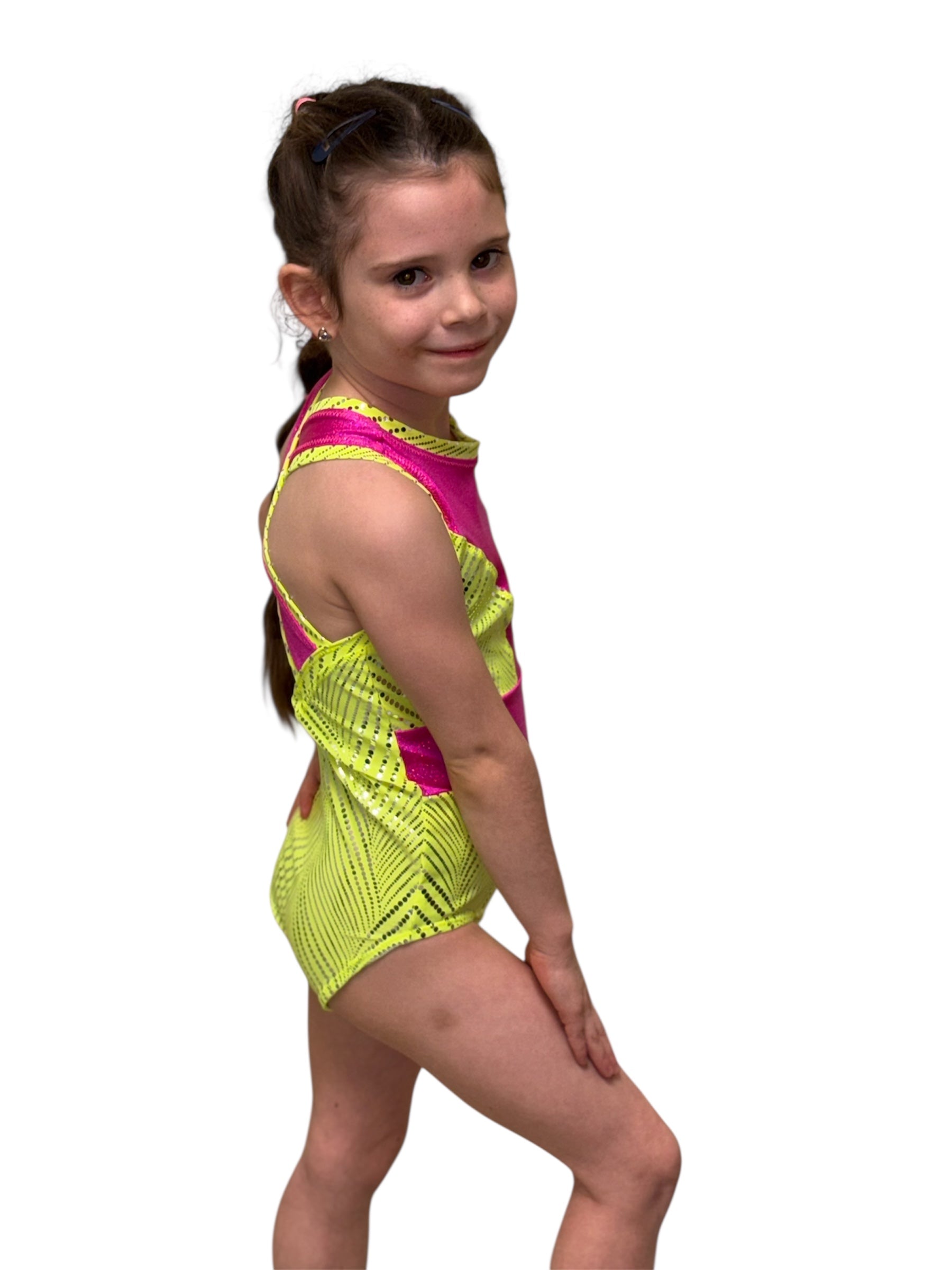 - gorgeous sparkly yellow and pink leotard with cross back straps, matching scrunchie