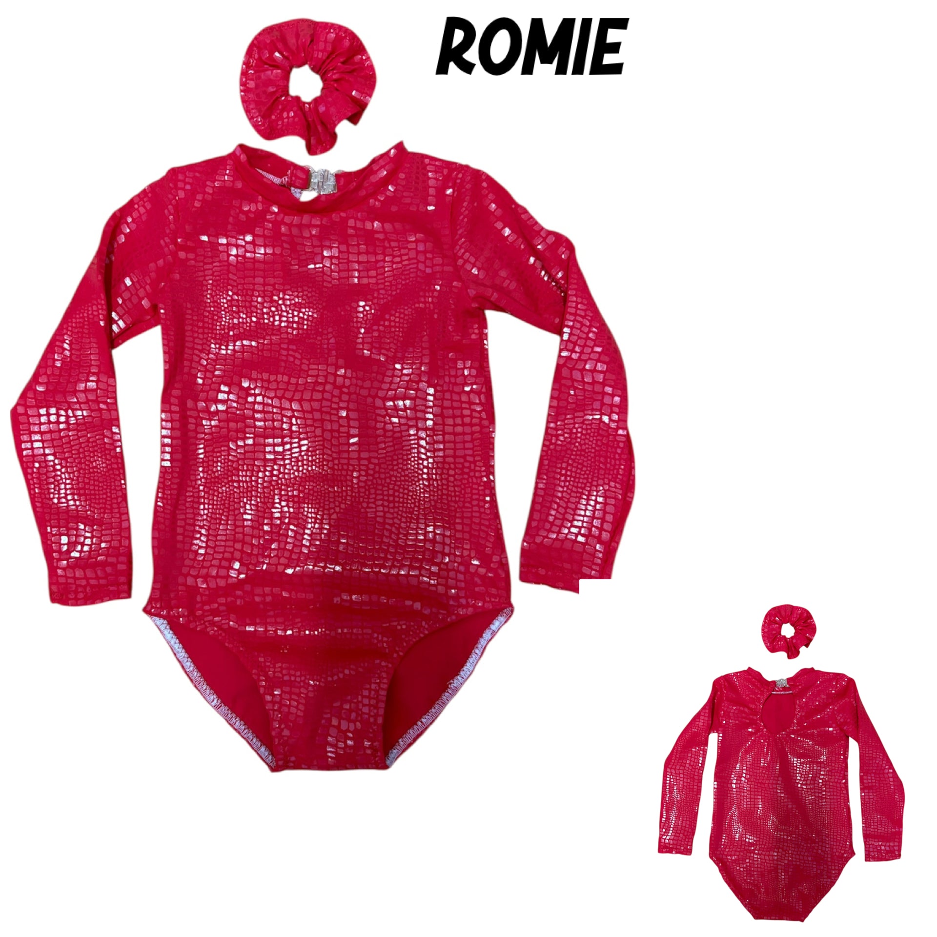 - long sleeve, high neck leotard, keyhole back leotard and matching scrunchie