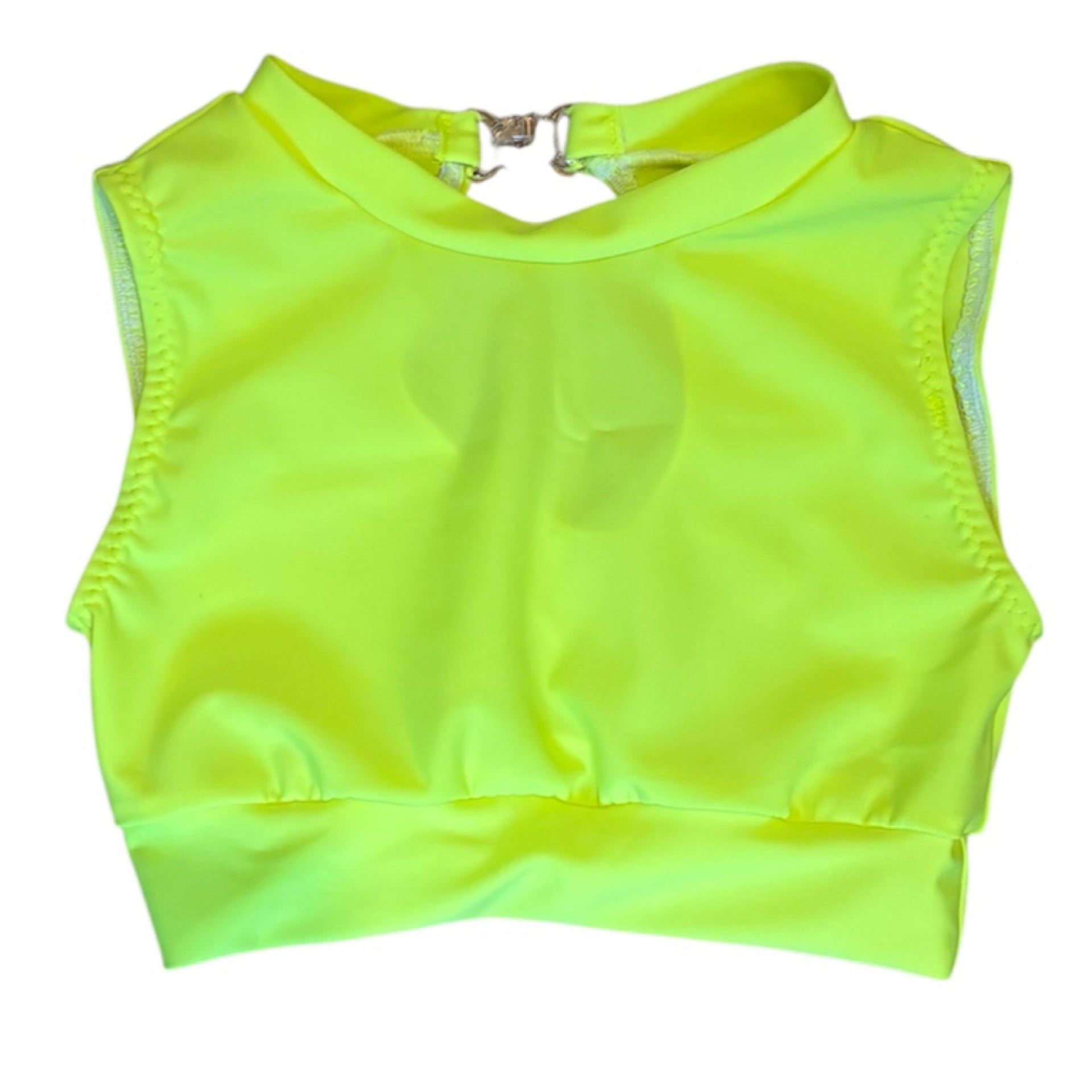 - sleeveless, keyhole back Lycra crop top available in neon red, turquoise, black, flo yellow, flo green, flo pink, flo orange
